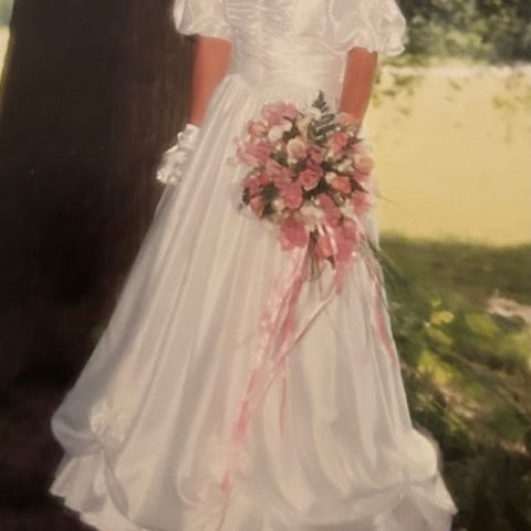 selger min brudekjole med perler og paljetter i str 46. Jeg er 1,68 høy. Slør følger med. Kjolen har hengt i boden i bryllupspose, men den har ikke vært renset etter bruk.
