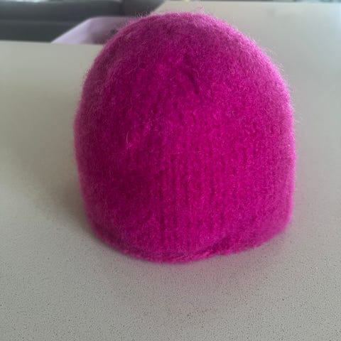 Kari Traa coralfarget acryl lue, dobbelstrikket. Kari Traa offwhite lue av 80 % ull, 20% nylon, og foret er 100% bomull, Strikket Bik bok lue av ull, acryl, mohair, elastan, nylon.