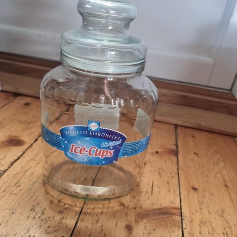 Artig krukke i hardplast med "innebygd" frukt i lokket.