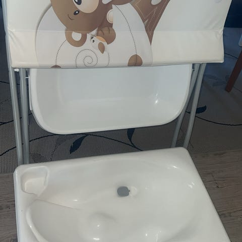 Praktisk stellekommode med 4 skuffer og låsbare hjul. Inkludert badebalje, stellematte og oppbevaringskopp. Kan også benyttes som vanlig kommode uten stelletopp/badekar.