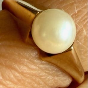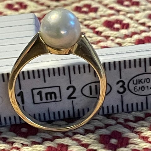 Gult gulls ring med ekte perle. Str. 54. Lite brukt. Kr. 2500. Heradsbygda