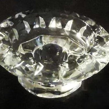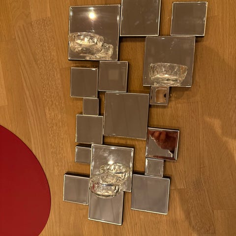 Selger en vakker fire-delt telysholder i krystall, plassert på et speilbrett med dekorative detaljer. Hver telysholder har et fasettslipt design som skaper nydelige lysrefleksjoner når stearinlysene er tent. Speilbrettet gir et luksuriøst preg til ethvert rom.