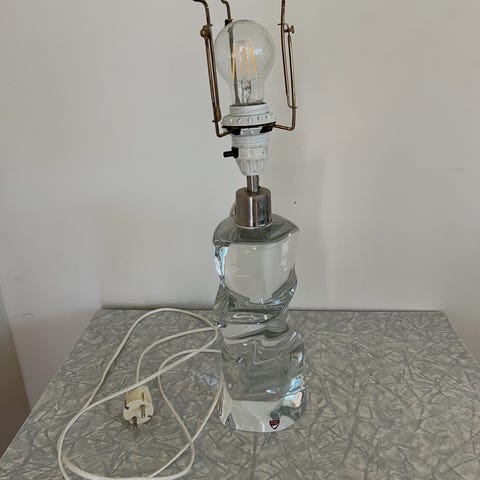 60-talls bordlampe i glass, Ice Glass fra Pukeberg, Sverige. Så vidt jeg kan forstå er disse lampene nokså sjeldne. Superfin, reto og nett bordlampe i glass!