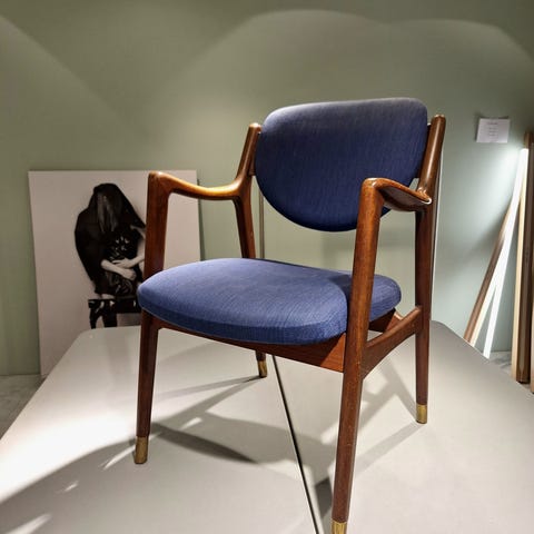 Veldig pent brukt stol i eik, designet av Adolf Relling i 1938 mens han fortsatt var student ved Statens Håndverks- og Kunstindustriskole (SHKS). Denne modellen ble også solgt på 1940-tallet, og er dermed en av de tidligste modellene fra Rastad & Rellings historie. Stolen har et grov-vevd stripete stoff uten flekker eller skader.