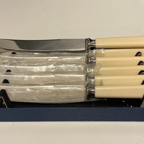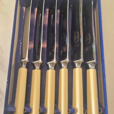 6 gamle kniver i eske. Merke Atkinson Bros. Sheffield. Lengde ca 24 cm.