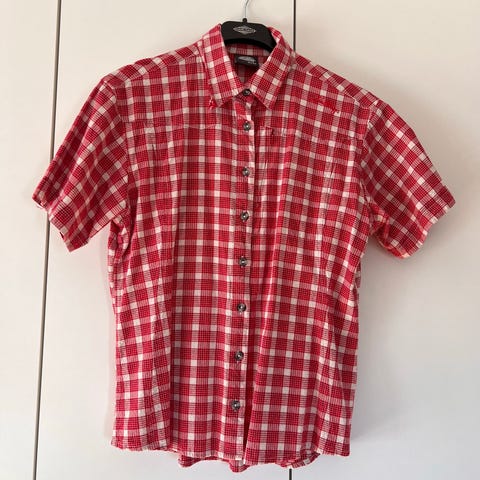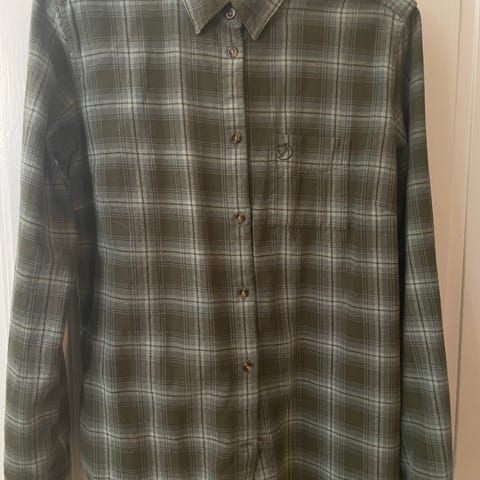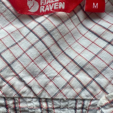 Rutete skjorte i rød og off-white. God kvalitet. Praktisk brystlomme med Fjällräven logo. Praktisk på reise og ideél til tur, eller selvsagt også på jobb eller skole. Slitesterkt stoff med mønster med stilige detaljer. Lite brukt.