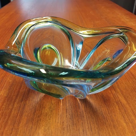 Vakker og veldig dekorativ glasskål i blankt/blå/grønt glass. I fin stand med noen bruksspor.