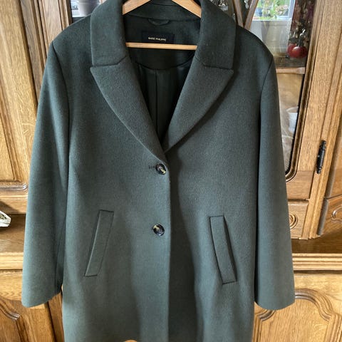 Str. M, passer også L. Lengde bak 102 cm. En lett flosset overflate, det går fram av bildene. . To små stikklommer i siden, kåpen lukkes med to knapper. Uforet. Kåpen er som ny. Kjøpt i Frankfurt.
