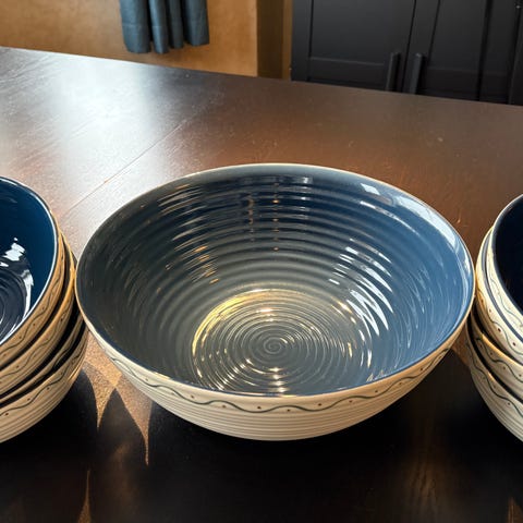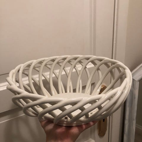 Keramisk fruktskål med et flettet design i blått. Slike skåler kalles også "Siciliakurv".