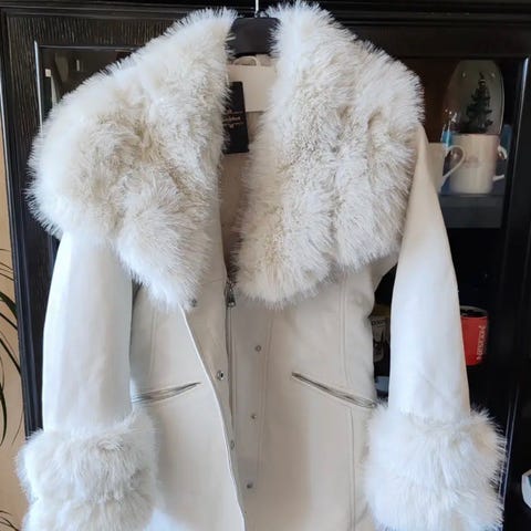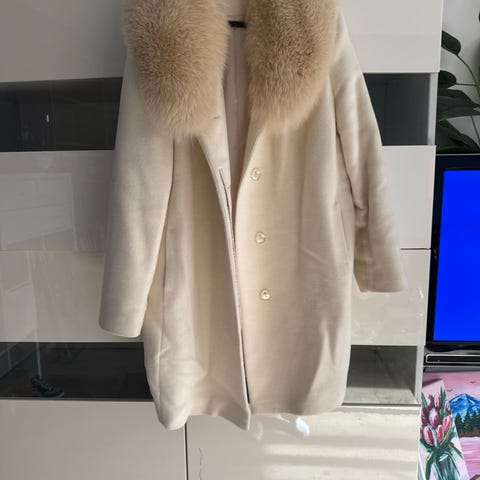 Lyse ( melk ) farget høykvalitets kåpe. Foret. Real fox fur. 70 % Virgin voll , cashmere 10%. 20 nylon. Laget I Dominicanske republikk, kjøpt i USA. Lengde 78 sm.