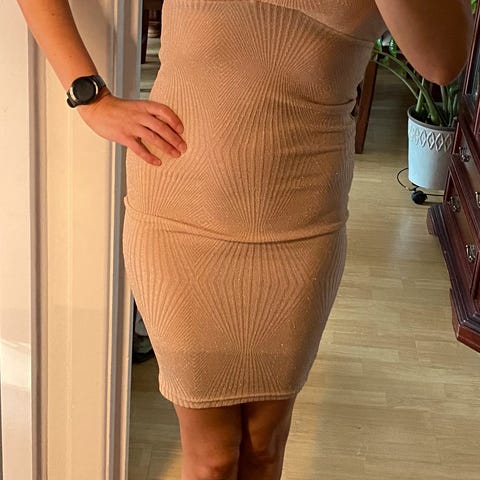 Kjempefin kjole i sølv/svart glitter. Stretchy modell så sitter pent inntil kroppen. Små skulderputer for statement. Drapert i sidene.