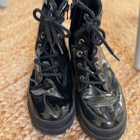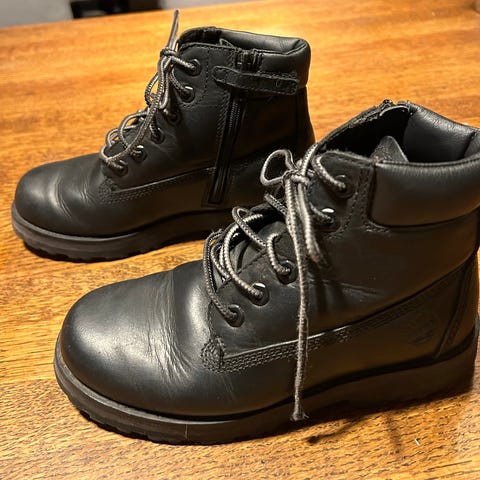 Selger et meget pent par mørkebrune støvler i skinn med denim kant fra Levi’s. Støvlene har både skolisser og glidelås på siden med borrelås som gjør at det er enklere for barnet å kombinere og kle på seg selv. Noen få bruksmerker som ikke er sjenerende og ellers er skinnet meget lite brukt. Det er fôret med tynn denim stoff på innsiden. Ved kaldere dager anbefales det ullsokker.