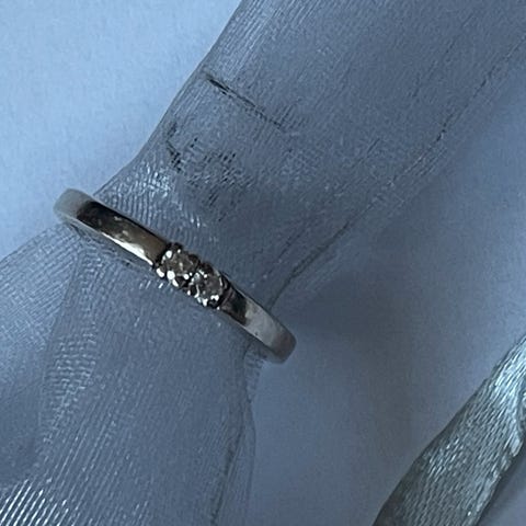 Diamantring i hvitt gull selges. Rundt 0,06 karat. 6 små diamanter. Kjøpt for noen år siden, men lite brukt. Størrelse 53.