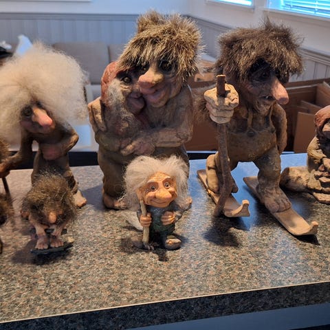 Troll med frimerke og en liten bok på 5 språk med info om trollets historie i Norge nummerert fra 1 tom 15. Håndlagde, og dekorert for hånd. Utgitt av Posten Norge, frimerketjenesten. Selges samlet, hentes eller sendes i posten, selger betaler for porto.