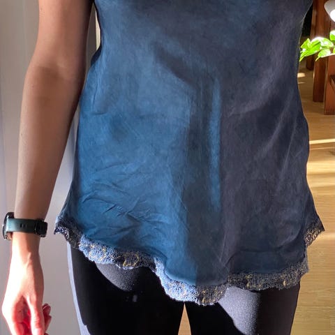 Keywords: satengtopp, blondetopp, blå topp, silkemyk, feminin, elegant, festtopp, camisole, chic, layering, tidløs stil, boho-chic, sommerfavoritt