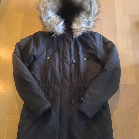 Pent brukt sort jakke med fuskepels krage på hetta. Det står at den er str. XS, men jeg syntes den passer en S. Den er delvis foret inni både i hetta og langs ryggen som vist på bildet. Den har ikke noen feil/mangler. Selges fordi den er blitt litt liten.