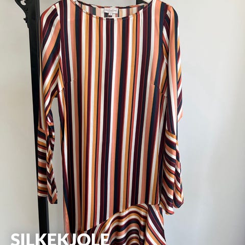 Kjolen har et tidløst, enkelt og smalt snitt. Fargespillet i silkestoffet og det smale, enkle snittet, gjør kjolen så elegant.