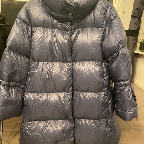 Kvalitetsjakke/kåpe. Fargen er konsistent mørk blå. Elegant dunkåpe, varm, vanntett, pustende og vindtett. To vanntette ytterlommer med glidelås, en innerlomme med glidelås, toveis glidelås og knappelukkning i front, har en A-form og kan snøres i nederkant om man vil endre formen.