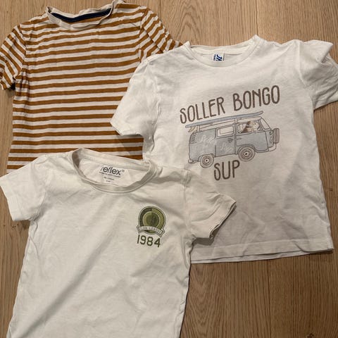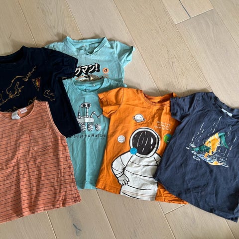 7 T-skjorter selges. Alle størrelser hører egentlig til str. 104. Pris for hver enkelt T-skjorte står under bildet.