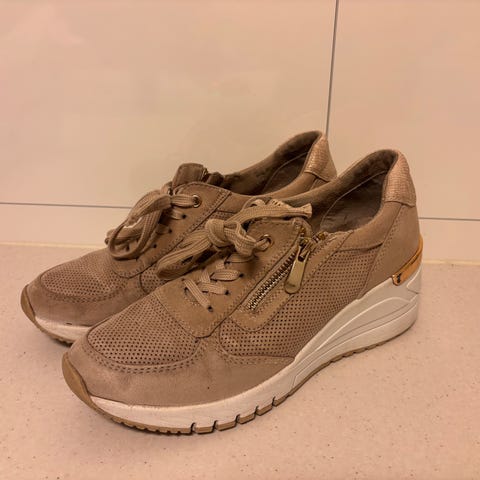 Beige, med snøring. Har også en praktisk glidelås slik at du ikke trenger knyte skoene når du tar dem av og på. Uttagbar innersåle.