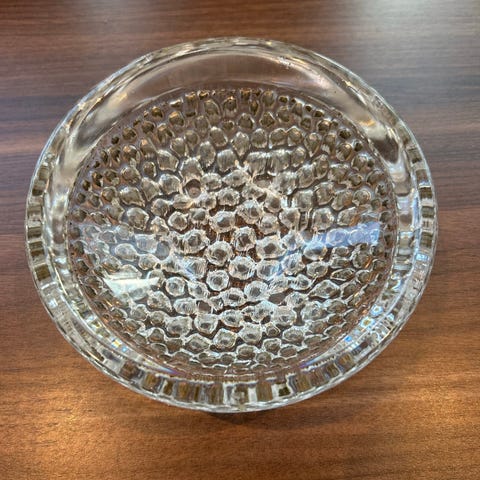 Ser hel og fin ut, men med nøye øyesyn er det en liten ripe i glasset ved bunnen. Dette kan ikke sees fra siden eller ovenfra.