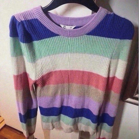 Myk, kul og fargerik genser med striper, fra merket Kule, i bomull og silke. Normal i størrelsen, bittelitt oversized.