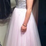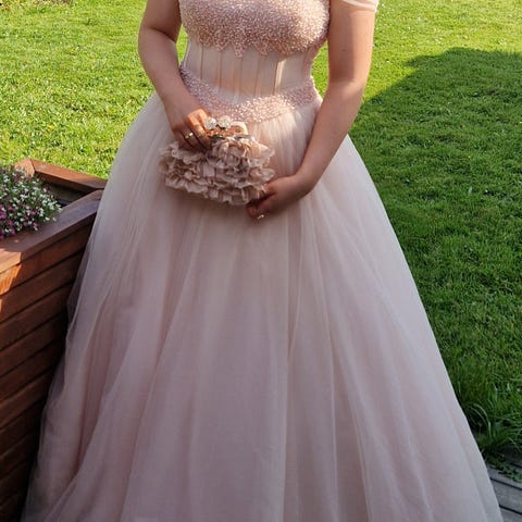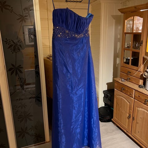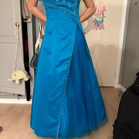 Lekker blå ballkjole med perler. Knytting i rygg.