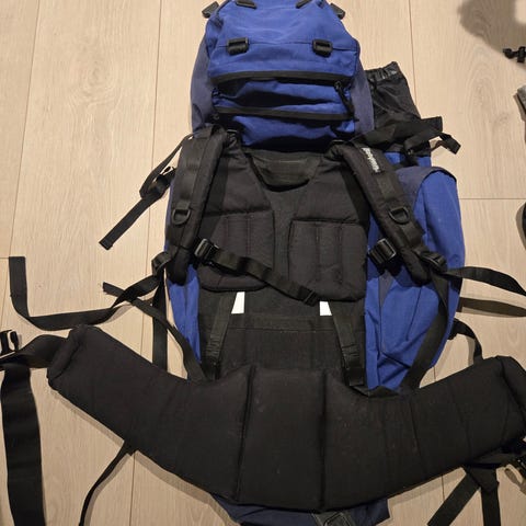Har en ganske ny bæremeis fra bergans jeg skal selge. Den kommer med 2 store lommer det er plass til en god del. En støtte, en regn"hatt" og fot holder for litt mindre barn