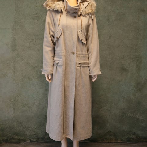 Den har store slag og den er ganske lang og den er fra ytterst på skulderen og ned er 98 cm, arm fra skulder og ned 66 cm, innside arm og ned er 48 cm og med jakken/kåpen lukket, så er den 57 cm over bysten.
