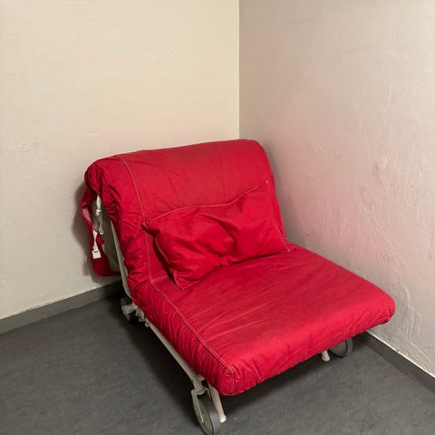 Avtagbart rødt trekk. Metall understell. Innebygget fortviler med spak.