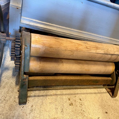 Klesrulle. Valser tøy. Tøyet rulles frem og tilbake i rulla for å glatte tekstiler av lin, bomull og andre naturfibre. Blir brukt til sengetøy, håndklær og duker og den slags.