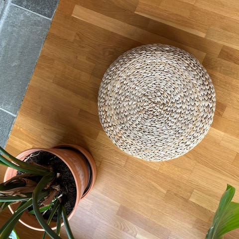 Puff i jute, sort og hvit, selges, diameter 57, høyde 45, aldri brukt, kun stått på gjesterom.