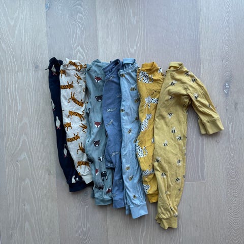 Fem nattdrakter fra kappahl, hm og reflex i str 74. Godt brukt, men fortsatt mye bruk igjen. Noen små hull, se bilder.