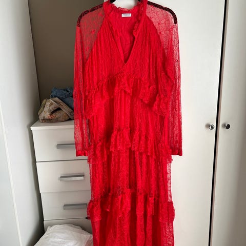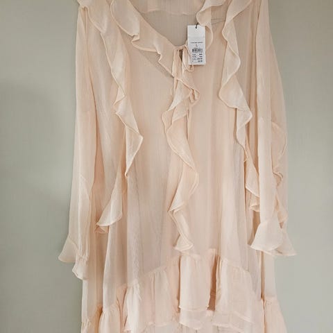 Kjempefin kjole med underkjole. Veldig pent og lite brukt. Selges rimelig grunnet flekk/bleking etter klorvann. Se bilde. Dette synes ikke noe særlig når kjolen er på.