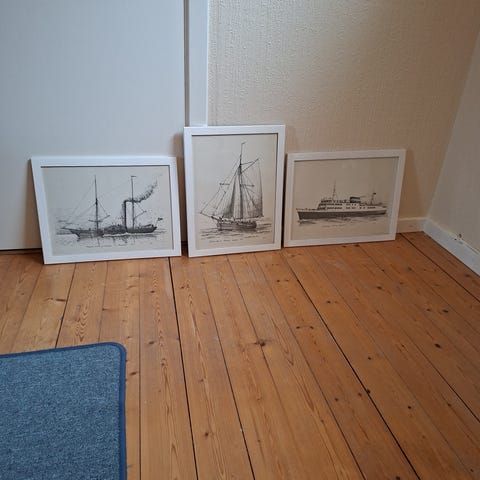 Maleri signert av T. Svendsen, 1974, med motiv av båter i rødt og sort selges. Retro. Malt på plate med beiset treramme. Noen skrammer på original ramme. Mål 119,5 cm x 49,5. Kan leveres i Lillestrøm og omegn.