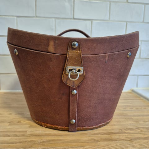 Vintage hattkoffert i brunt materiale med rund form og klafflås. Kofferten har en enkel stropp for lukking og et foret innvendig rom som beskytter hatten. Egnet for oppbevaring og transport av hatt.
