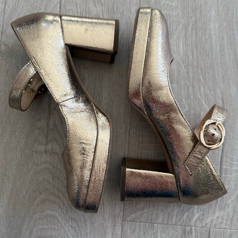 Grå glitter, kun brukt på foten en time innendørs. Helhøyde 8 cm, 2 cm såle
