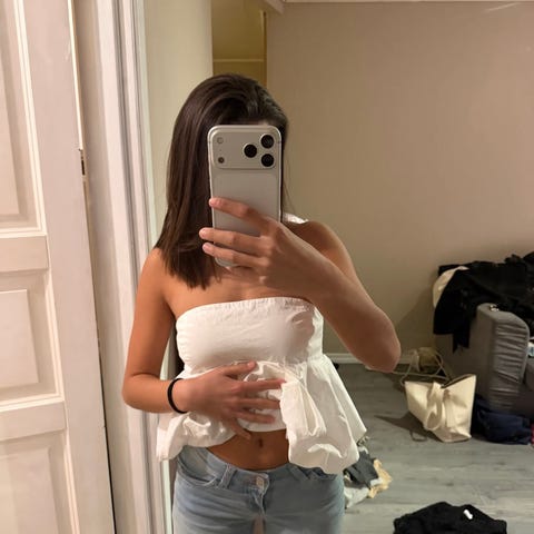 Veldig kul topp som er kortere foran enn bak. Deilig flagrende materiale