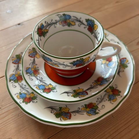 Selger pent brukt stemor kaffeservise fra Porsgrunn porselenfabrikk. 12 asjetter, 12 skåler, 10 kopper, fløtemugge, sukkerkopp og 2 små kuvertskåler. Lite brukt. Bare vasket for hånd.