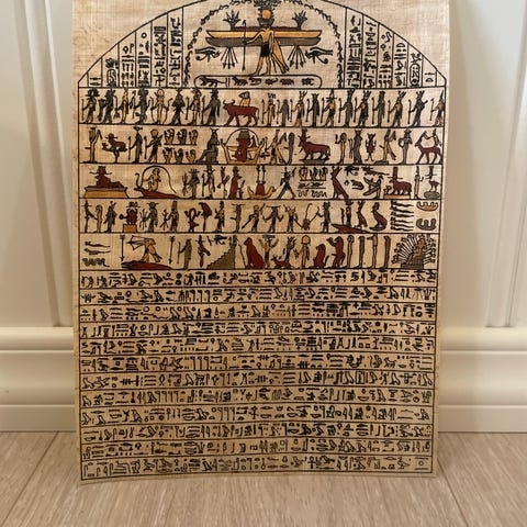 Det hieroglyfiske alfabet, på papyrus og med glass og solid ramme. 33 x 24 cm.