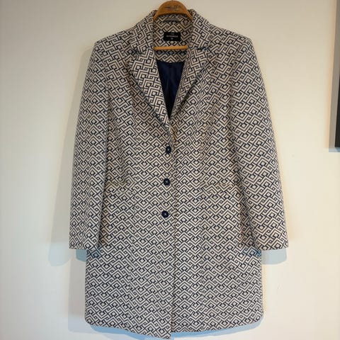 Mønstret i offwithe, mellomblå og med tynne gulltråder. To lommer i siden og en innerlomme.