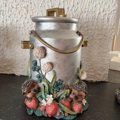 Melkespann med pinnsvin som hviler rundt . Flotte detaljer med små marihøner , blomster og jordbær rundt .