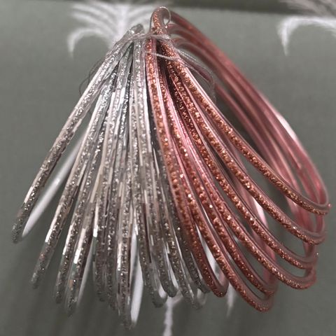 Sett med 21 sølv farge armbånd, (noen få brukt 1_2 gang. ) ellers alt bare ligget i smykkeskuffen. De tynne str ca 6,5 andre de bredere ca. 6, 8