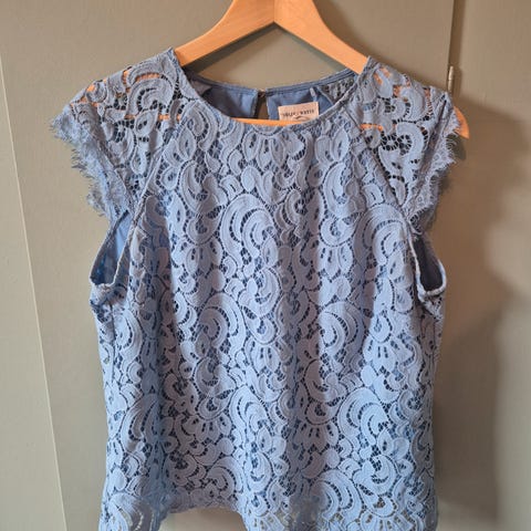 Pen bluse/topp fra Lindex med blonder øverst, gull-knapp bak i nakken og ¾ arm.