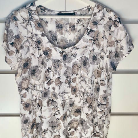 Pen sort bluse/topp med dekorative gullprikker, knapp bak i nakken og ¾ arm. Skulderpartiet og armene har et lag stoff og er delvis gjennomsiktig. Resten er av blusen har to lag stoff og er ikke gjennomsiktig. Stoffet faller pent på kroppen. Kan brukes både til hverdags og fest.