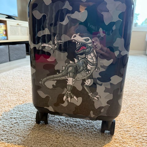 Rullekoffert fra Beckmann med dinosaurmotiv. Blålilla farge. Brukt, men i god stand.