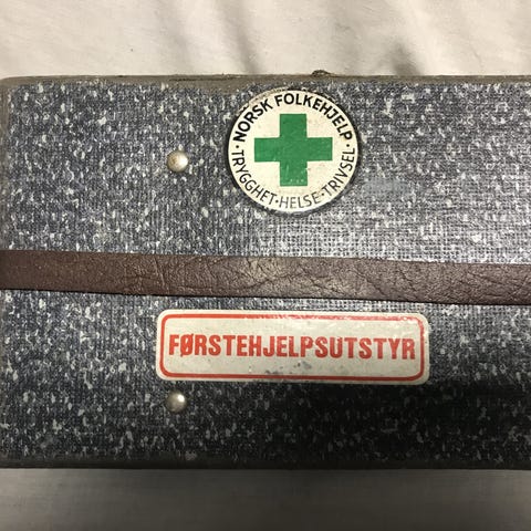 Førstehjelpskrinet er fra 80 tallet og ser ubrukt ut. Det er i god stand for alderen.