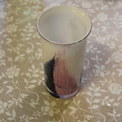 Beige vase med flerfarget mønster.