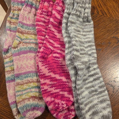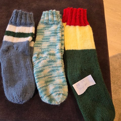Hjemmelaget strikkesokker i god kvalitet strikket i slitesterkt sokkegarn.Selges for 200kr pr.par. Har i størrelsene 36-40 og 40-46