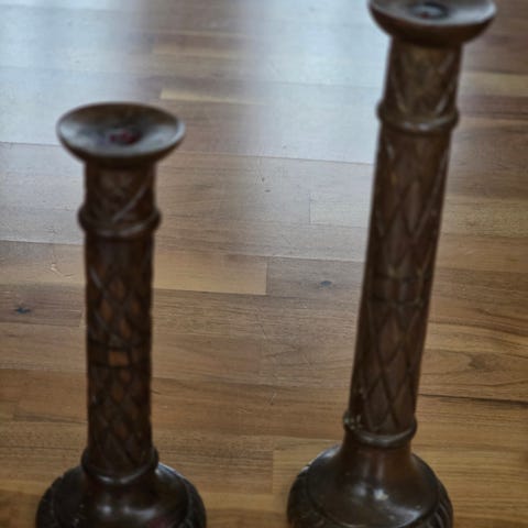 2 stk. lysestaker i treverk. H= 23 cm og fot er Ø 10,5 cm. Dekorative og koselige. Den ene har et lite merke på foten, se bilde. dette kan lett fikses med en tusj.
